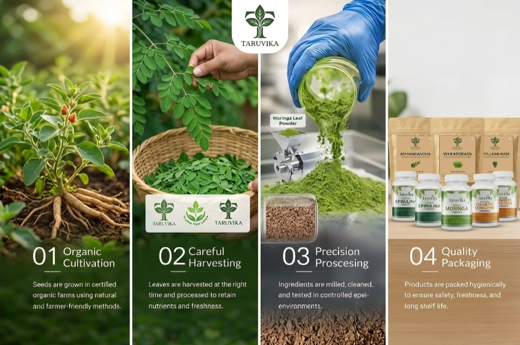 Every Taruvika product follows a careful journey — from organic cultivation to hygienic packaging — ensuring purity and premium quality.